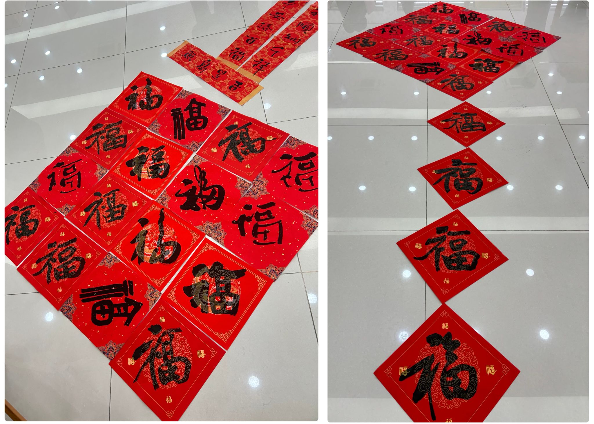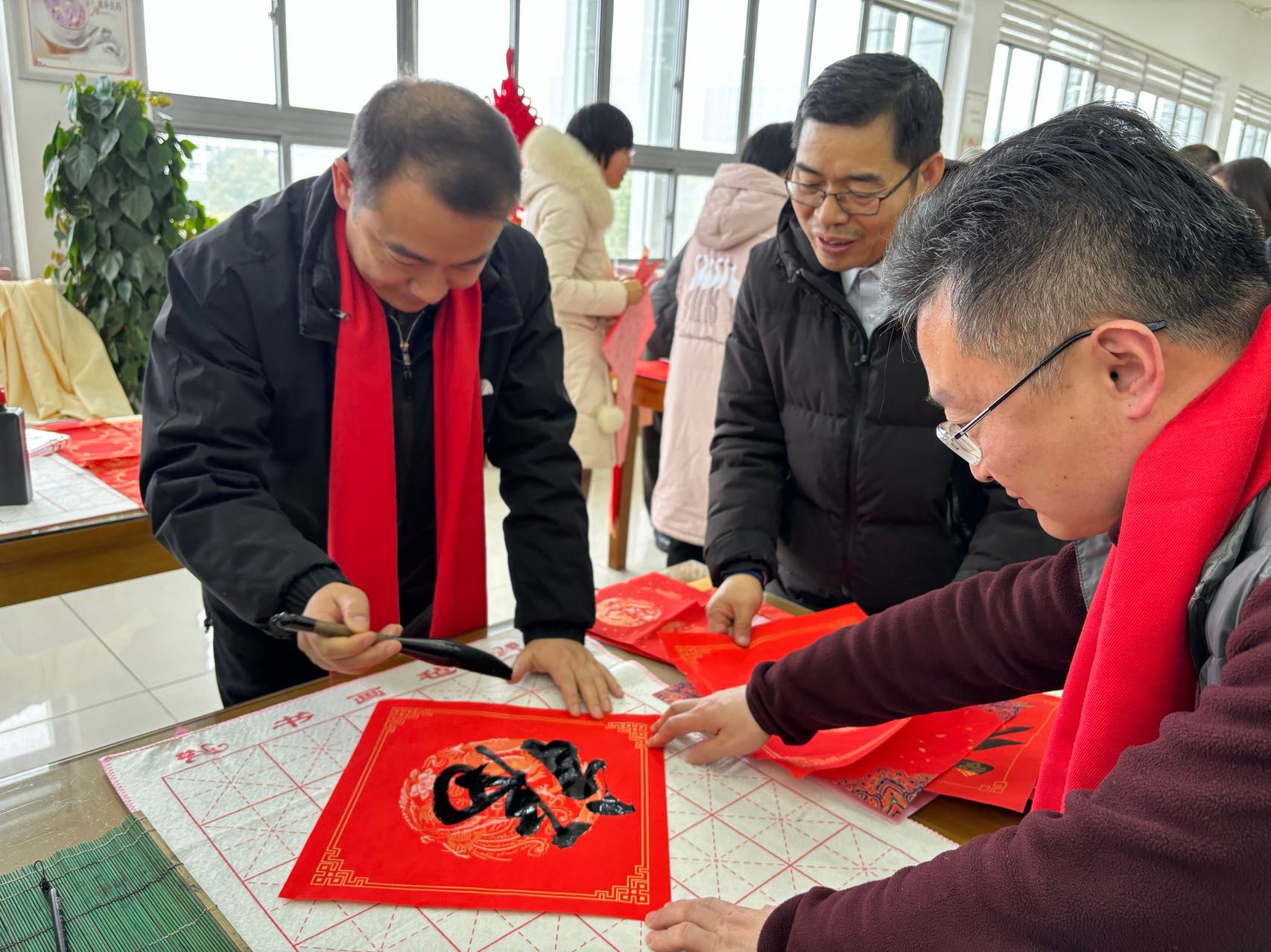 活动现场墨香满溢,热闹非凡,教职工们围绕在书画协会的老师们周围,争相邀请他们为自己写上对新春的期盼和对美好幸福生活的向往。两个多小时的时间,老师们全情创作,挥毫泼墨,妙句成双,将祝福浓缩于字里行间,或苍劲有力,或飘逸隽秀,楷、行、隶、篆、草各式各样的书体跃然纸上,迎祥纳福,令人大饱眼福。对联幅幅充满春意,字字饱含深情;现场满桌“福”气,暖意融融。