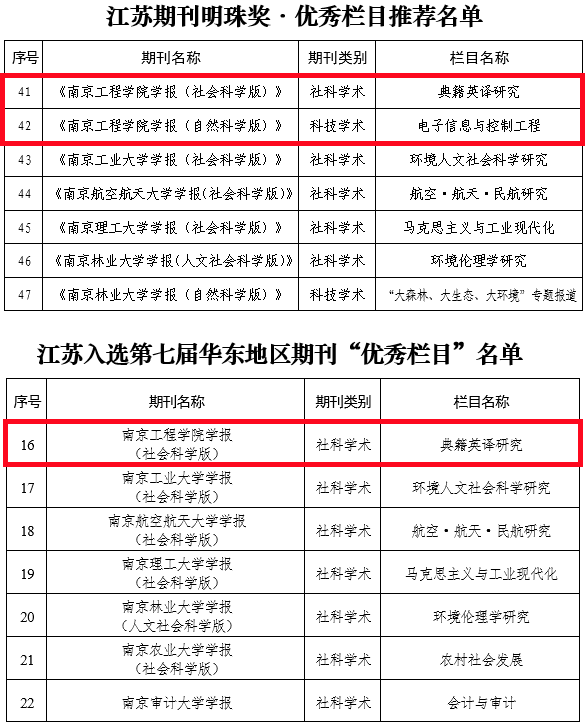 近日,江苏省期刊协会发布《关于江苏期刊明珠奖·优秀栏目推荐结果的通报》《关于江苏入选第七届华东地区期刊“优秀栏目”推荐活动的通报》,凯发k8官网学报(社会科学版)“典籍英译研究”、凯发k8官网学报(自然科学版)“电子信息与控制工程”2个栏目被评为江苏期刊明珠奖·优秀栏目;其中“典籍英译研究”栏目被推荐参评华东地区期刊“优秀栏目”并成功入选。