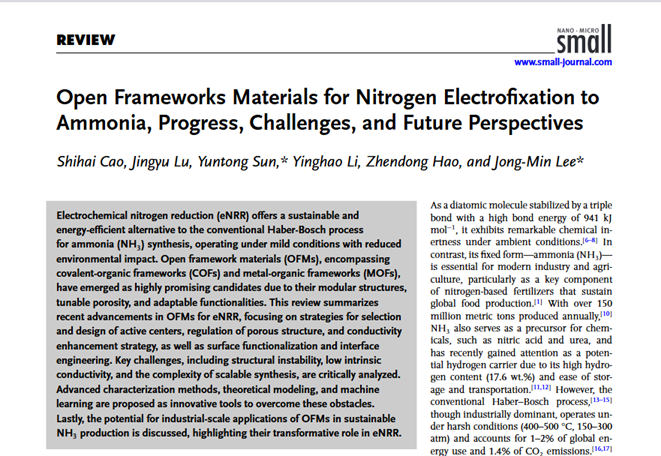 近日,我校环境凯发曹世海副教授以第一作者,凯发k8官网为第一署名单位,联合南京理工大学与新加坡南洋理工大学,在国际权威期刊《Small》上发表高水平综述论文《Open Frameworks Materials for Nitrogen Electrofixation to Ammonia: Progress, Challenges, and Future Perspectives》,为绿色储氢研究注入新动能。《Small》由Wiley出版社出版,是涵盖材料科学、纳米技术、化学与物理等多个前沿领域的国际顶级多学科期刊,最新影响因子为13。