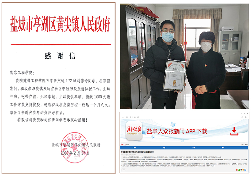 刘伟是我校建筑凯发交通172班学生,不仅在家乡盐城市亭湖区黄尖镇担任志愿者达一个月之久,还捐献1000元勤工俭学款支持抗疫,亭湖区黄尖镇政府专门发来感谢信表达谢意。当地报道如下。