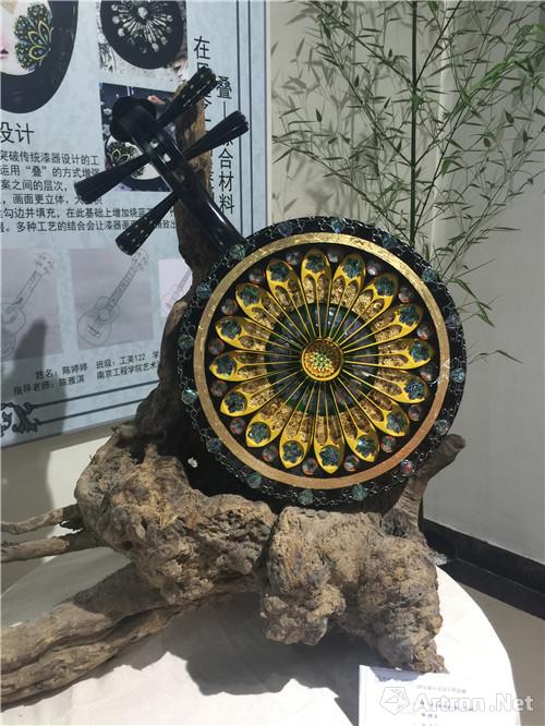 本设计作品,在月琴上融合了漆艺以及雕刻重叠等技法,呈现出独特的光影重叠之美。融入中国园林设计中的借景艺术,达到一种收无限于有限的效果。打破了传统漆器装饰中平面布局的局限性,增加了空间构成方法。用“叠”的方式丰富其图案造型,使平面的装饰过渡到立体的装饰,这也给传统的漆器装饰工艺注入新的构成理念。主体采用螺钿镶嵌工艺,利用螺钿本身美如锦、色如霞的特点,使得画面色彩更为富丽。用精美的花丝工艺作为辅助,丰富了线条的表现力。让漆艺陈设品进入现代文化休闲空间,表现“琴瑟在御,岁月静好”的生活意趣。