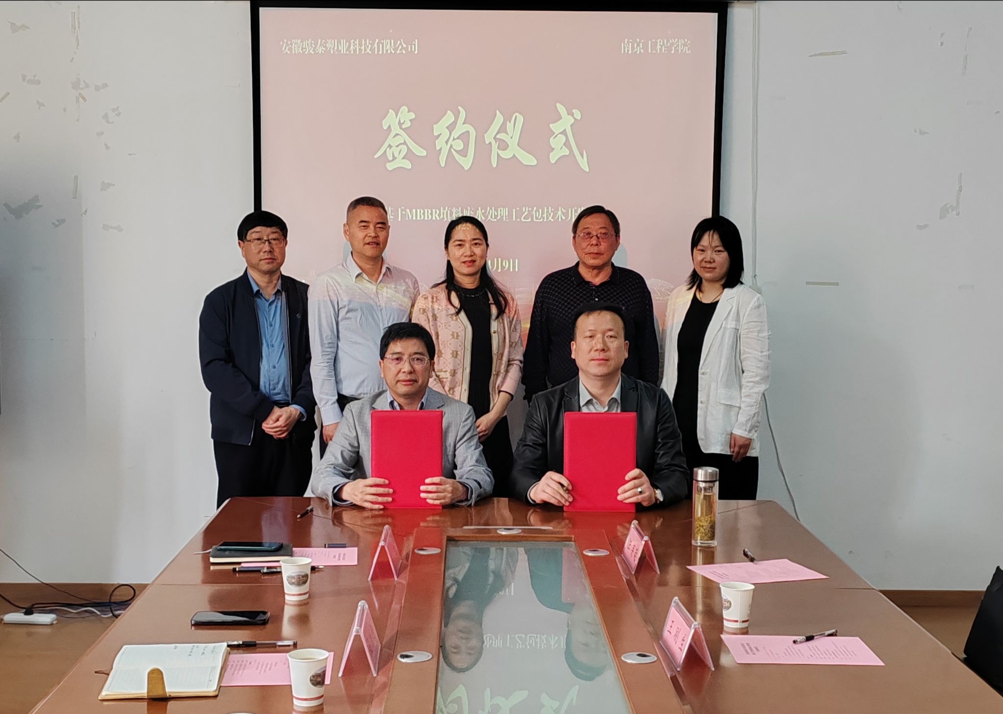 会上,在与会人员的见证下,吴功德与安徽骏泰塑业科技有限公司总裁吴柯青签署技术开发合同,明确双方在MBBR填料废水处理工艺领域开展联合攻关。